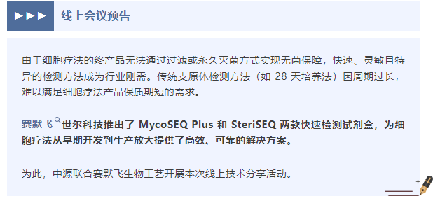 賽默飛世爾科技推出了MycoSEQ Plus 和 SteriSEQ 兩款快速檢測試劑盒,為細胞療法從早期開(kāi)發(fā)到生產(chǎn)放大提供了高效、可靠的解決方案。 為此,中源聯(lián)合賽默飛生物工藝開(kāi)展本次線(xiàn)上技術(shù)分享活動(dòng),就在明天下午2點(diǎn),快來(lái)報名吧~25-06-06