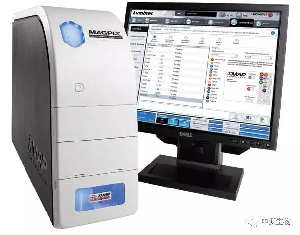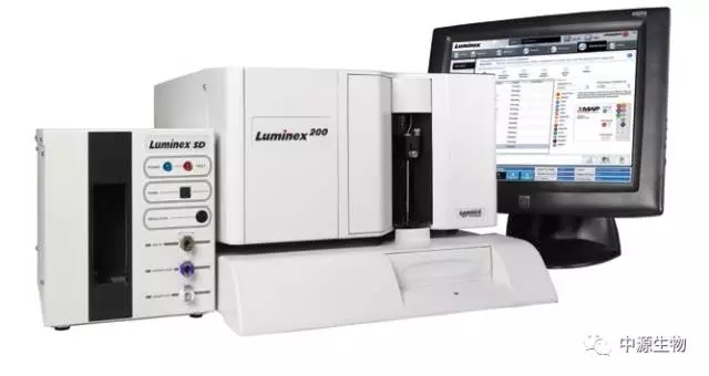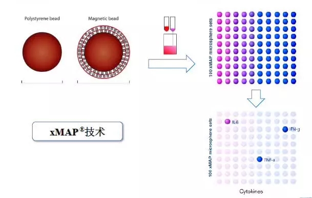 Luminex 技術(shù)應用微球和流式細胞儀的原理。微球內部含有兩種不同顏色的免疫熒光,通過(guò)熒光不同的比例可以區分多達100種不同的微球。每種微球可以用來(lái)檢測一種不同的蛋白或基因。因此,利用微球技術(shù)可以同時(shí)檢測高達100個(gè)蛋白。該技術(shù)利用熒光編碼的微球共價(jià)交聯(lián)單克隆抗體,與被測定的目標分子結合后,加入熒光素標記的檢測抗體,再通過(guò)激光掃描熒光編碼來(lái)識別單個(gè)微球和測量“檢測熒光”強度來(lái)確定被測分子的濃度。