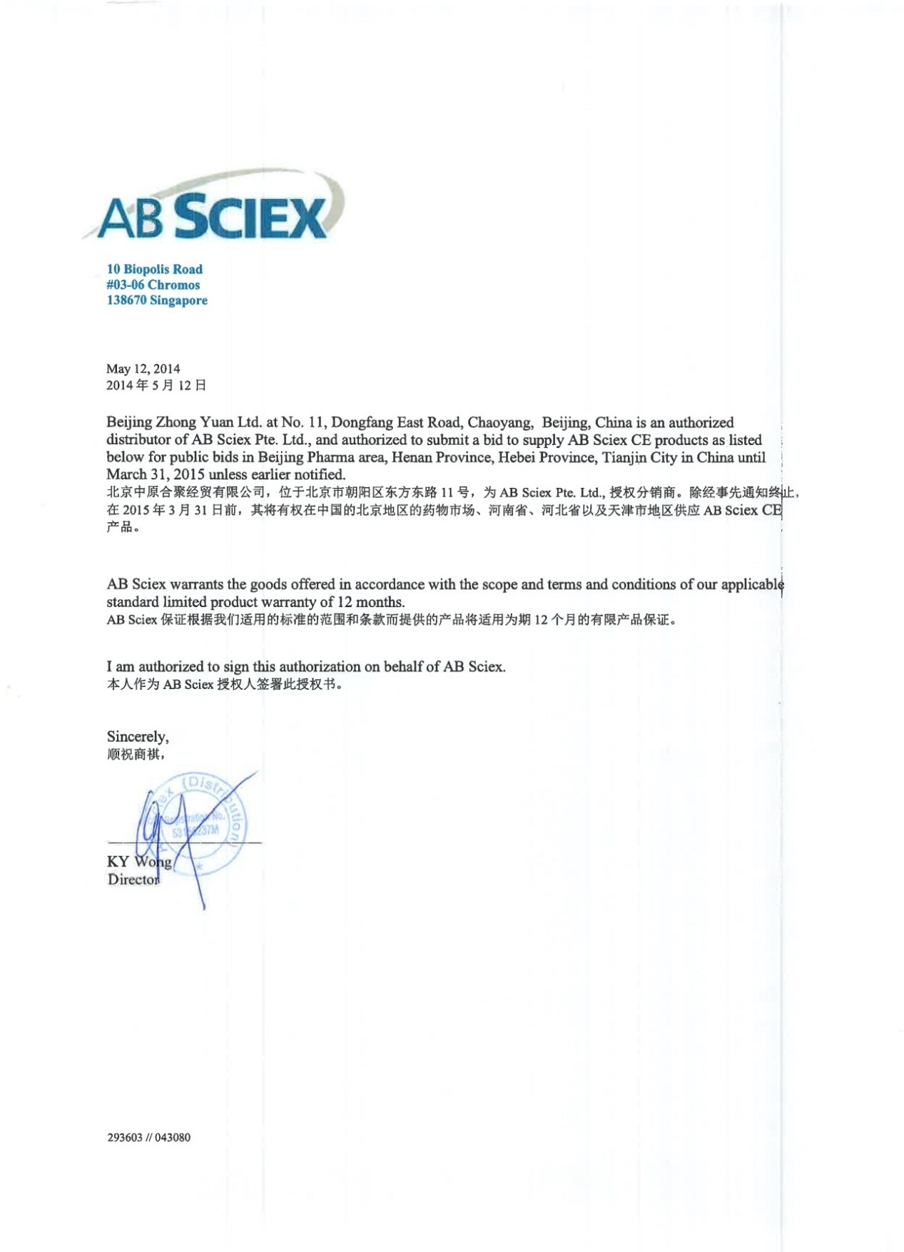 2014年4月1日,北京中原公司正式成為AB Sciex Pte. Ltd., 授權分銷(xiāo)商。中原公司有權在中國的北京地區的藥物市場(chǎng)、河南省、河北省以及天津市地區供應AB Sciex CE產(chǎn)品。