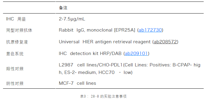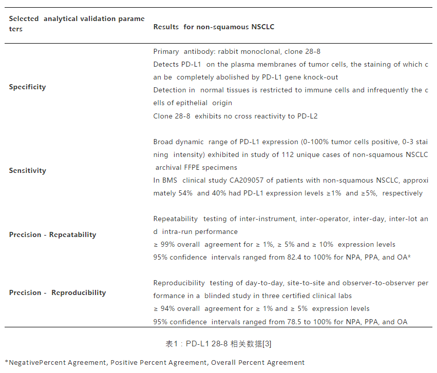 如表1所示,PD-L1[28-8]作為PD抑制劑的補充診斷抗體,已經(jīng)獲得了FDA批準用于NSCLC和黑色素瘤患者的臨床診斷[3],具有特異性(經(jīng)KO驗證)、具有高靈敏性(兔單抗RabMab)、高重復性(重組抗體)等優(yōu)點(diǎn)。