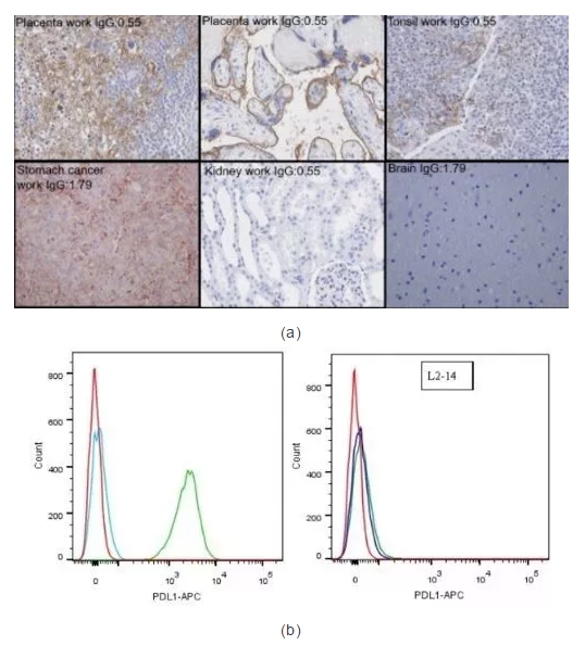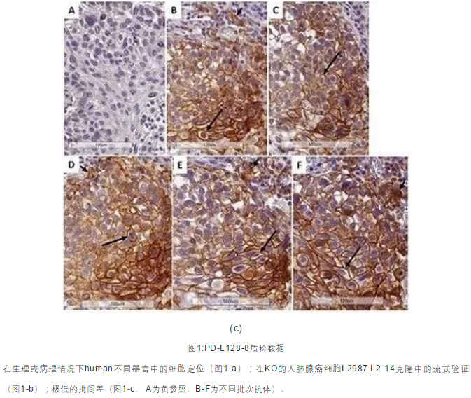 在生理或病理情況下human不同器官中的細胞定位(圖1-a);在KO的人肺腺癌細胞L2987 L2-14克隆中的流式驗證(圖1-b);極低的批間差(圖1-c, A為負參照,B-F為不同批次抗體)。