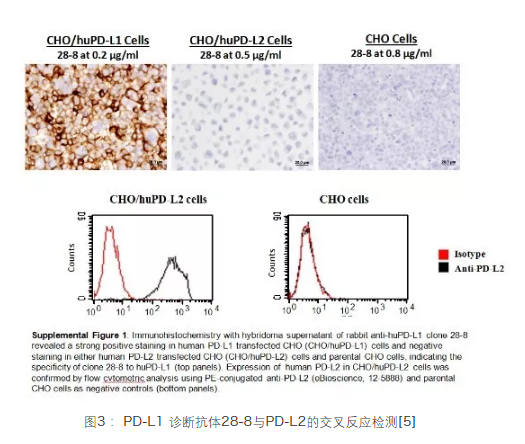 如圖3所示:無(wú)論是IHC檢測還是流式檢測,PD-L1診斷抗體28-8與PD-L2并無(wú)交叉反應,呈現出高特異性[5]。