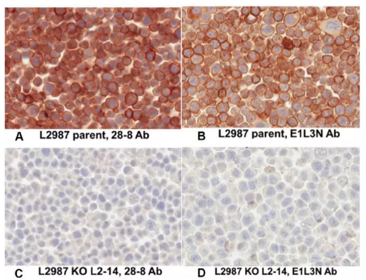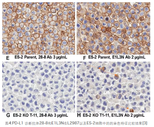 如圖4,Abcam[28-8] vs CST [E1L3N],數據顯示有些PD-L1診斷抗體并不特異[6],作者分別使用PD-L1 28-8和 E1L3N 抗體,對野生型和敲除的人肺腺癌細胞系L2987和人卵巢透明細胞癌細胞系ES-2的石蠟切片進(jìn)行了IHC染色:在其他條件保持一致的情況下,兩種抗體(2 ug/mL)在L2987的KO細胞中均未檢出信號(圖7A-D);28-8(3 ug/mL)在ES-2的KO細胞中未檢測到信號,但E1L3N(2 ug/mL)卻呈現了非特異的胞漿染色(圖7E-H),這可能是因為識別了胞漿中的非PD-L1抗原[7]。