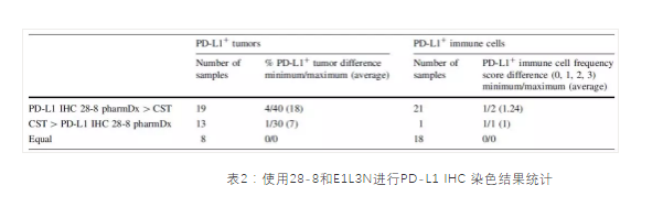 對20名NSCLC和20名黑色素瘤患者的TC和IC的IHC檢測結果顯示:相對于E1L3N,28-8是一個(gè)更優(yōu)秀的伴隨診斷抗體[3]。