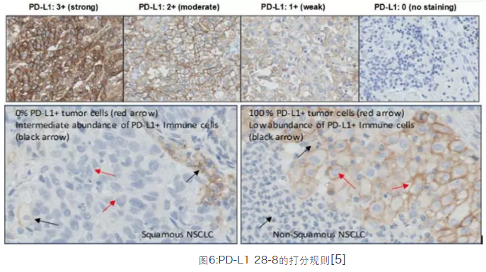 如圖6所示,PD-L1蛋白表達的定義是腫瘤細胞所呈現的任何強度的細胞膜陽(yáng)性的百分率,細胞質(zhì)染色(如果存在)不參與評分。根據陽(yáng)性參照(可使用細胞石蠟切片)的染色結果將染色強度分為0(negative)、1+(weak intensity)、2+(moderate intensity)以及3+(strong intensity);在至少兩個(gè)染色強度條件下,至少80%細胞顯示膜染色陽(yáng)性,負參照背景強度小于1同時(shí)無(wú)膜著(zhù)色信號。