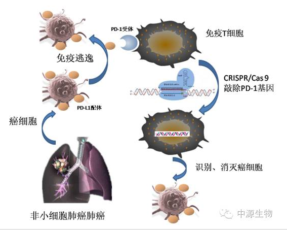 這項臨床試驗的招募對象是患有非小細胞肺癌,且癌癥已經(jīng)發(fā)生擴散,化療、放療及其他治療手段均已無(wú)效的患者。在治療癌癥的研究中,將人體免疫T細胞分離出來(lái),利用CRISPR/Cas9技術(shù)進(jìn)行基因編輯,選擇性地敲除PD-1基因,進(jìn)而將T細胞潛在的對腫瘤細胞的攻擊能力“激活”。在體外進(jìn)行T細胞培養擴增后,再輸回患者體內攻擊腫瘤細胞,從而達到治療目的。