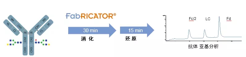 IgG抗體經(jīng)過(guò)FabRICATOR酶切后,添加還原劑,可將IgG還原成三部分Fd', LC ,Fc/2。質(zhì)譜圖顯示FabRICATOR將IgG抗體完全酶切。