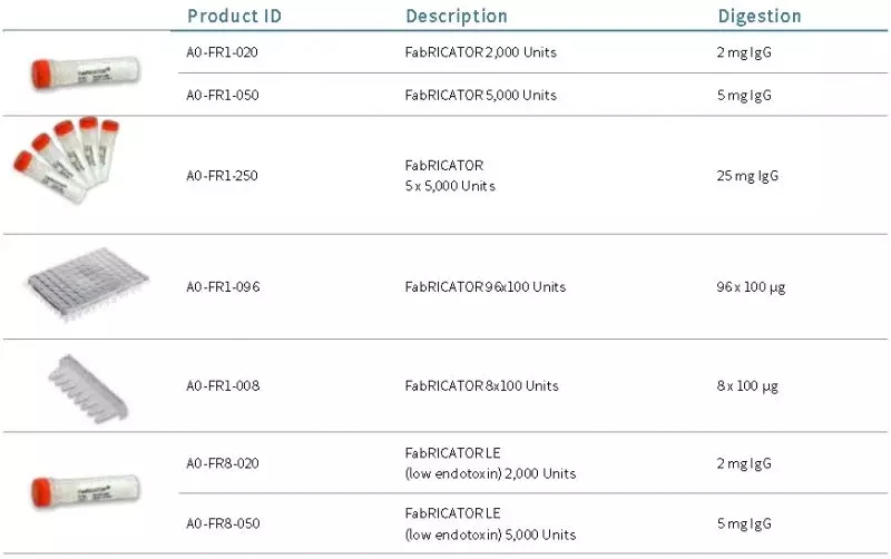 FabRICATOR® (IdeS) 是一種獨特的半胱氨酸蛋白酶,在鉸鏈區下方的一個(gè)單一氨基酸位點(diǎn)酶切IgG,可對多種來(lái)源的IgG進(jìn)行酶切(人源,鼠源,兔,猴,綿羊、嵌合IgG、Fc融合蛋白等),特點(diǎn)是:高特異性單一酶切位點(diǎn),30分鐘快速酶切,操作簡(jiǎn)單快捷。