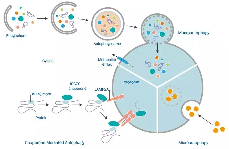 自噬是將大分子和細胞器轉運至溶酶體,使其降解和回收再利用的過(guò)程。這一過(guò)程的目標是消除過(guò)量或有缺陷的細胞器以及聚集的衰老蛋白。在水解之后,基本的分子原件被回收到細胞質(zhì)中,作為細胞的組成材料或能量來(lái)源。因此,自噬在細胞內穩態(tài)機制中起著(zhù)關(guān)鍵作用,控制著(zhù)細胞的可用資源和能源消耗之間的平衡。