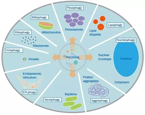 胞質(zhì)成分會(huì )被成批降解或選擇性自噬靶向降解,哺乳動(dòng)物的選擇性自噬依賴(lài)于兩種主要成分:選擇性自噬受體和脂化LC3(微管相關(guān)蛋白輕鏈3)蛋白。它們的相互作用使得不同細胞成分發(fā)生特異性降解,這些細胞成分包括線(xiàn)粒體、內質(zhì)網(wǎng)、聚集蛋白和核糖體等。