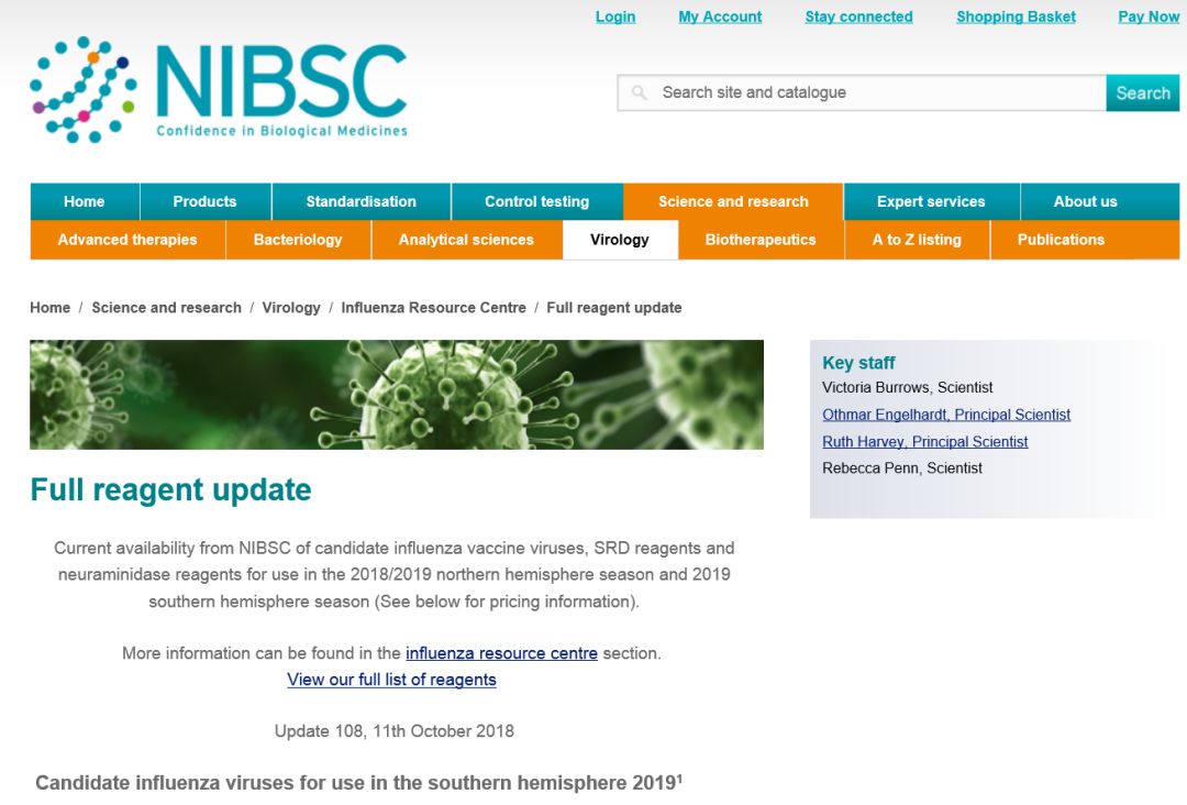 前NIBSC可提供2018/2019年北半球季節和2019年南半球季節使用的候選流感疫苗病毒、SRD試劑和神經(jīng)氨酸酶試劑。近期NIBSC更新了南半球2019年候選流感病毒,以下是NIBSC的網(wǎng)址,請您查閱。