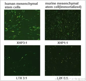 圖3. X-tremeGENE HP對難轉細胞系的轉染效果優(yōu)于脂質(zhì)體轉染方法。應用GFP編碼的質(zhì)粒對人/鼠間充質(zhì)干細胞進(jìn)行轉染。XHP 3:1表示用X-tremeGENE HP及相應的轉染試劑(μl): 質(zhì)粒DNA (μg)比例進(jìn)行轉染(圖片來(lái)源于網(wǎng)絡(luò ))。