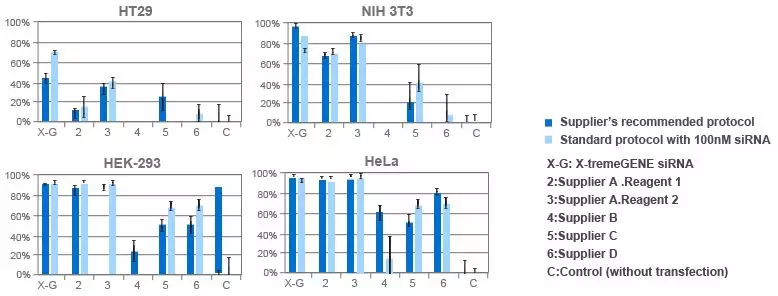 圖4. X-tremeGENE siRNA Transfection Reagent用于4種細胞系的HPRT基因沉默實(shí)驗。根據各試劑說(shuō)明書(shū)建議的操作流程,或標準實(shí)驗方法,將100nM HPRT特異性siRNA轉染至4種細胞。 通過(guò)LightCycler® h-HPRT Housekeeping Gene Set的熒光定量法評估基因沉默效率。結果顯示X-tremeGENE siRNA Transfection Reagent在四種細胞中轉染后基因沉默表現均表現優(yōu)異。