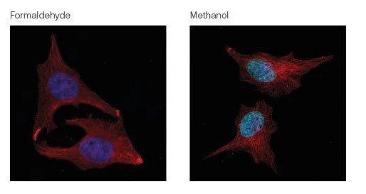 圖 1:固定劑對免疫染色效果的影響。和甲醛固定(左)相比,用甲醇固定的 HeLa 細胞(右)中更易檢出組蛋白 H2B K5 巴豆?;庖呓M化結果。一抗:ab177139,組蛋白 H2B(K5巴豆?;┑耐枚嗫寺】贵w,1 μg/mL。二抗:ab150081,山羊抗兔 IgG H&L (Alexa Fluor® 488),0.5 μg/mL。DAPI 染核, ab7291 搭配ab150120 染微管蛋白(紅色)。