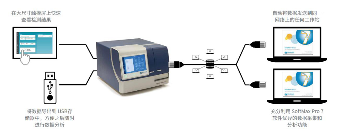 讀板機正面嵌入大尺寸、高分辨率的觸摸屏,您可以通過(guò)交互式界面調用內置的 SoftMax 觸屏軟件程序,方便調用預制模板進(jìn)行檢測或根據需求修改模板進(jìn)行相應實(shí)驗,無(wú)需外置專(zhuān)用的電腦。