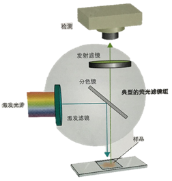 多色熒光顯微鏡。典型的免疫熒光設置包括光源、適合目的熒光染料的濾光片組合,以及檢測機制。
