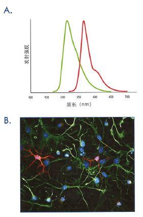 R&D Systems的 NorthernLights 熒光色素有著(zhù)不重疊的光譜性質(zhì),非常適合多色IHC和ICC。A. NorthernLights-493 anti-goat igG(貨號 NL003:綠色)和 NorthernLights-557 anti-mouse IgG(貨號 NL007:紅色)的發(fā)射曲線(xiàn)。B. 利用 anti-rat Nestin 親和純化的多克隆抗體(貨號 AF2736:綠色)和 anti-neuron specific beta-III Tubulin 單克隆抗體(克隆號 TUJ-1)(貨號 MAB1195:紅色)多色檢測大鼠皮層干細胞中的 Nestin和 beta-III Tubulin。細胞經(jīng)過(guò)NorthernLights-493(貨號 NL003:綠色)和 NorthernLights-557(貨號 NL007:紅色)二抗染色,并經(jīng) DAPI(藍色)復染。