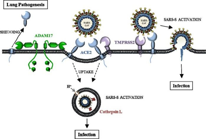 SARS-CoV-2 和 SARS-CoV 同源性約為 80%,目前研究顯示,SARS-CoV-2 和 SARS-CoV 都是通過(guò)病毒表面的刺突蛋白(Spike)與人體黏膜細胞表面的 ACE2(血管緊張素酶 2)結合使病毒與宿主細胞膜發(fā)生融合進(jìn)入細胞,再經(jīng)由宿主細胞的蛋白酶 TMPRSS2、Cathepsin B/L 切割 Spike 蛋白使病毒釋放出 RNA。