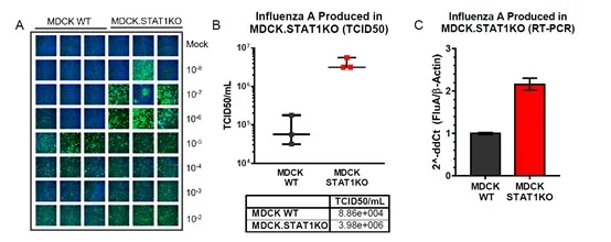 實(shí)驗證明基因編輯后的細胞沒(méi)有STAT1蛋白表達,與親本細胞系相比,病毒產(chǎn)生能力明顯增加,接種甲型流感(H1N1;ATCC®VR-1736™)后,病毒滴度提高了30倍。