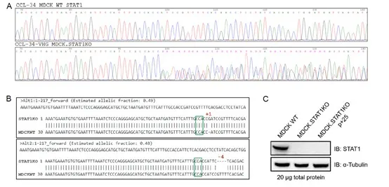 圖2. STAT1-KO-MDCK 細胞特征。(A)MDCK.STAT1KO 細胞 STAT1 基因測序結果證實(shí)STAT1基因斷裂。(B)測序結果顯示,MDCK.STAT1KO 細胞是一個(gè)雜合子。一條等位基因存在單一堿基插入,另一個(gè)等位基因存在4堿基的缺失。(C)WB結果顯示,無(wú)論是低代次還是高代次, MDCK.STAT1KO 細胞都沒(méi)有 STAT1 蛋白表達。