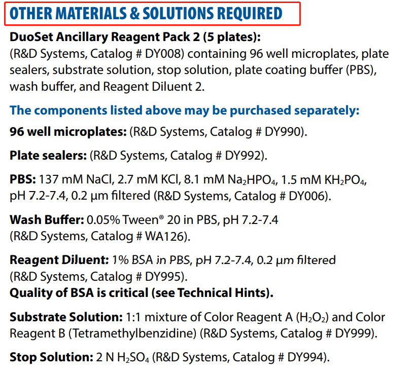 那么要順利開(kāi)展完整的 ELISA 實(shí)驗,DuoSet® ELISA 試劑盒需要搭配哪些附屬試劑?我們的產(chǎn)品說(shuō)明書(shū)提供了詳細信息。