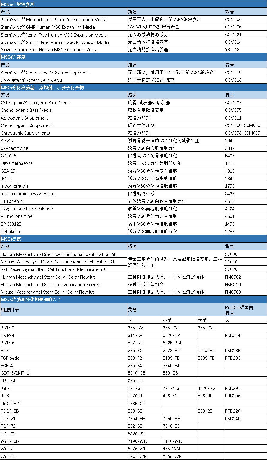 Bio-Techne 可提供 BM-MSCs 及 HSCs 分離、鑒定、培養、誘導分化的全套解決方案,以 MSCs 的研究為例: