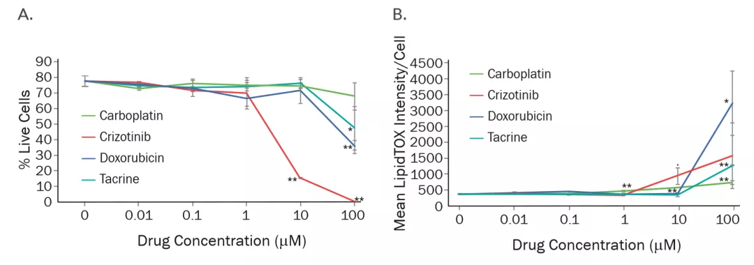 圖 3 使用 StemXVivo Hepatocyte Differentiation Kit 將 iPSK3 人誘導多能干細胞再分化為肝細胞樣細胞,并將細胞接種于 96 孔板中,使用肝毒性化合物(Carboplatin、Doxorubicin、Crizotinib、Tacrine)進(jìn)行篩選。細胞活力(A)和脂質(zhì)代謝(B)分析表明,肝毒性化合物對 iPSCs 衍生的肝細胞的毒性具有劑量依賴(lài)性。
