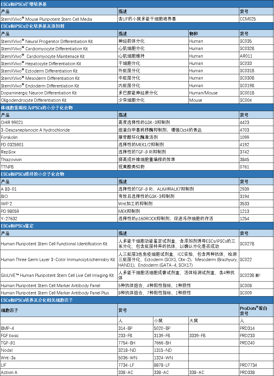 多能干細胞的鑒定與研究包括培養、分化、驗證等環(huán)節,Bio-Techne 可提供相關(guān)的培養基、試劑盒、細胞因子及小分子化合物: