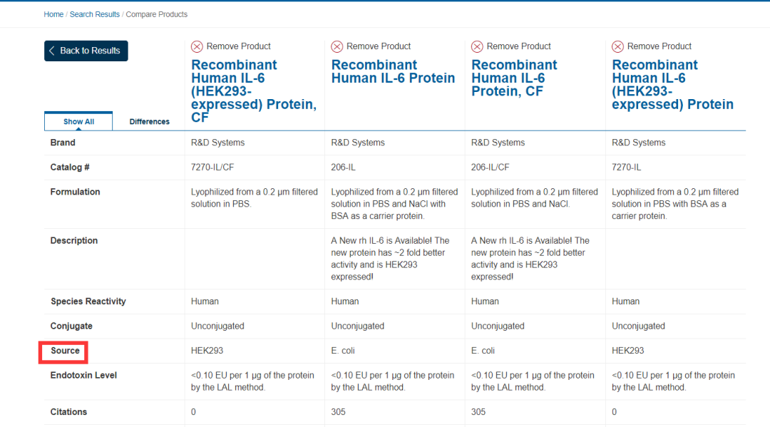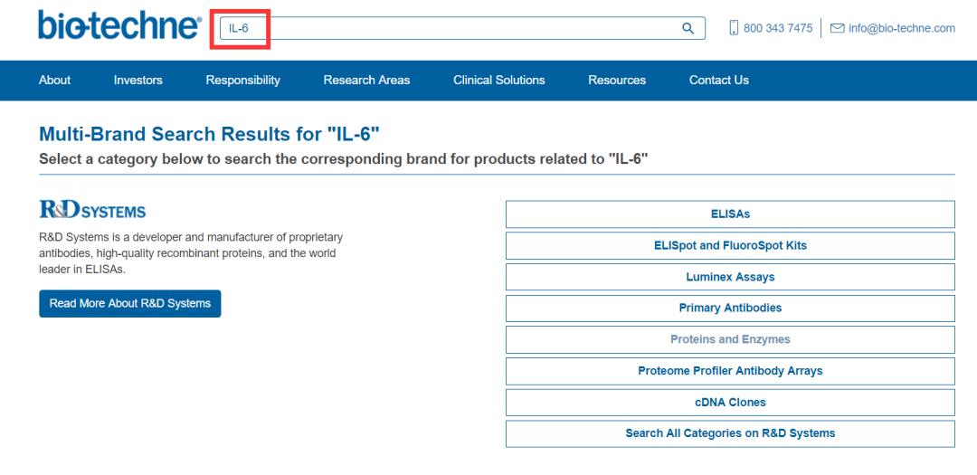 此時(shí),Bio-Techne 旗下 R&D Systems®,Novus Biologicals®,Tocris®,ProteinSimple® 都列出了包含 IL-6 的所有產(chǎn)品類(lèi)型(下圖僅列出了 R&D Systems® 品牌的相關(guān)產(chǎn)品)。