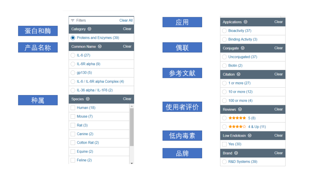 點(diǎn)擊「Proteins and Enzymes」,進(jìn)入到如下頁(yè)面,可以看到有 39 個(gè)產(chǎn)品,下圖對 Filters 中的每一欄也作出中文解析,這里重點(diǎn)介紹一下 Applications 中的 Bioactivity 和 Binding activity 的含義: