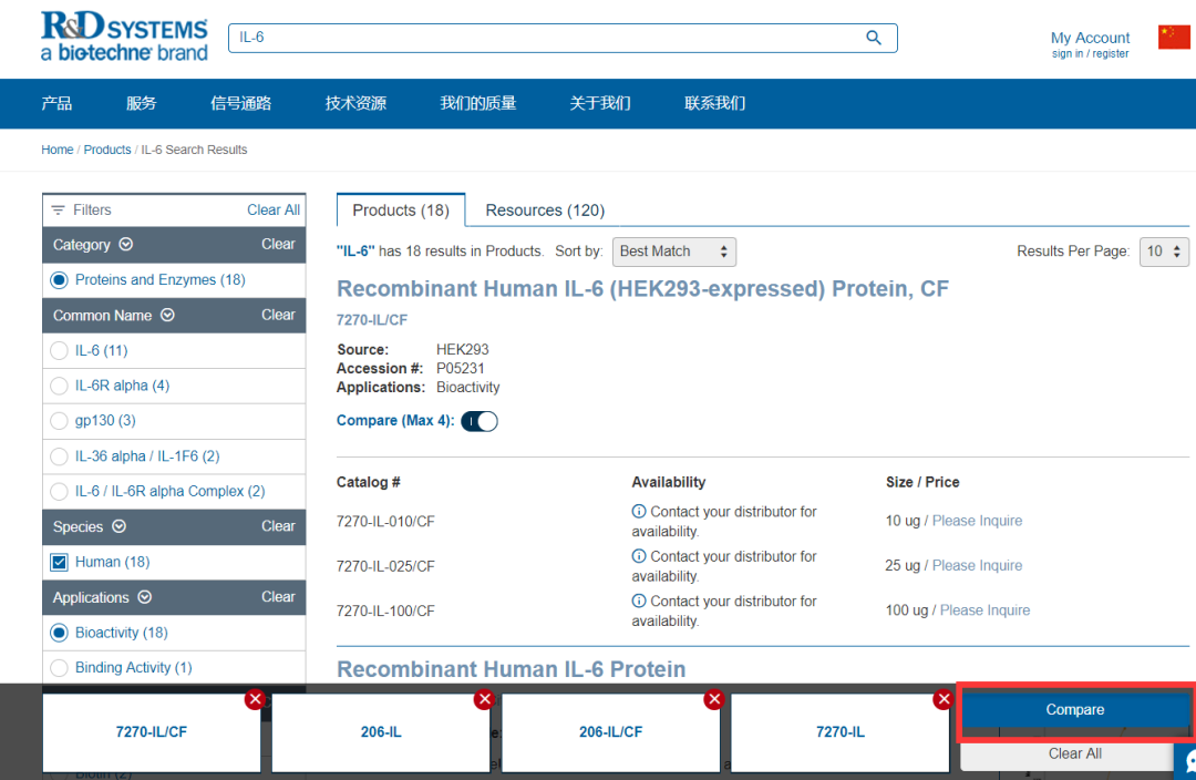 這里也告訴大家 R&D Systems®對比產(chǎn)品的獨門(mén)秘籍:「Compare」功能,最多可以選擇 4 個(gè)產(chǎn)品,我們以頁(yè)面上的前 4 個(gè)產(chǎn)品為例,選取之后,點(diǎn)擊右下角的「Compare」,