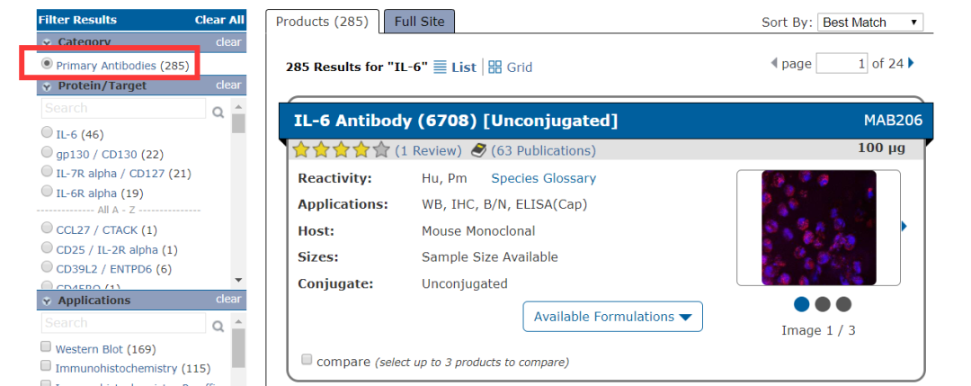 根據上述蛋白的選擇方法,首先選擇正確的產(chǎn)品名稱(chēng) Protein/target,發(fā)現不僅有 IL-6,還出現了 gp130/CD130、IL-7R alpha/CD127 和 IL-6R alpha。這是因為 IL-6 是一種多效性細胞因子,通過(guò)與配體特異性的 IL-6 受體(IL-6R)和共同的信號轉導受體(gp130)組成的受體系統發(fā)揮生物學(xué)功能,所以也會(huì )搜索出和 IL-6 相關(guān)的抗體。