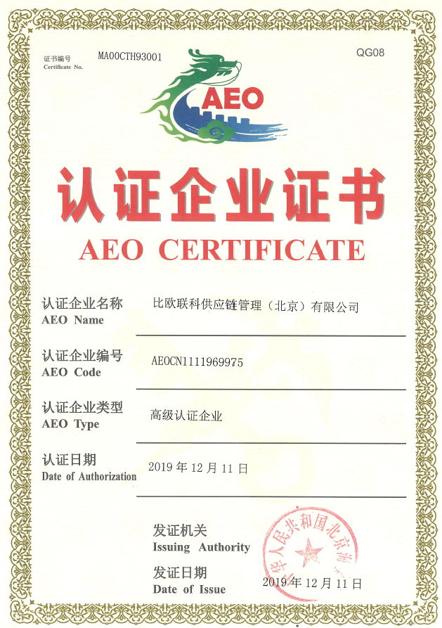 比歐聯(lián)科供應鏈管理(北京)有限公司持有AEO高級認證企業(yè)證書(shū),這意味著(zhù)我司在內控管理、風(fēng)險控制、信息化管理等方面得到海關(guān)的認可,標志著(zhù)我司將享有優(yōu)先通關(guān)放行、較低查驗率、AEO互認國家或地區海關(guān)提供的通關(guān)便利,有助于國際國內商務(wù)合作展開(kāi),維護國際品牌形象,縮短辦理時(shí)間,降低供應鏈及通關(guān)成本。