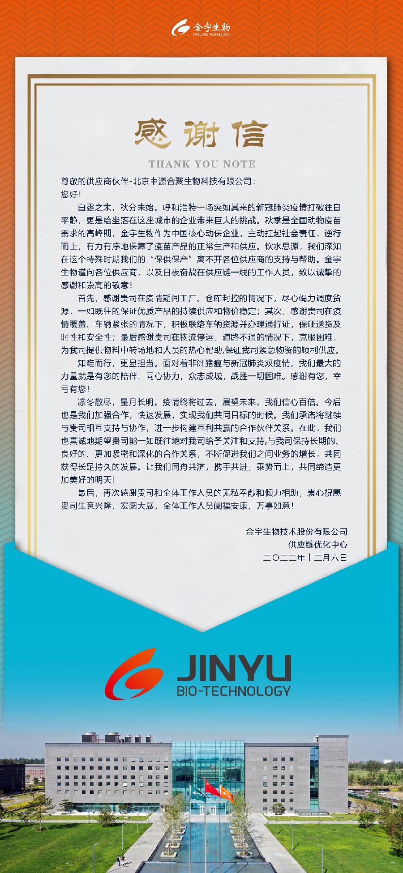 以下為金宇生物感謝信全文: