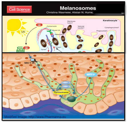 2、 皮膚色素沉著(zhù)是一個(gè)多維度且復雜的過(guò)程;黑色素,在黑色素細胞中產(chǎn)生,在黑色素小體中包裝,隨后胞吐到細胞外,接著(zhù)被相鄰的角質(zhì)細胞內吞。