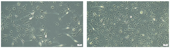 圖2、hTERT永生化新生兒黑色素細胞形態(tài)與典型的黑色素細胞形態(tài)類(lèi)似。用高倍和低倍倒置顯微鏡在10倍物鏡下拍攝貼壁黑色素細胞的融合圖像。(比例尺為82微米)