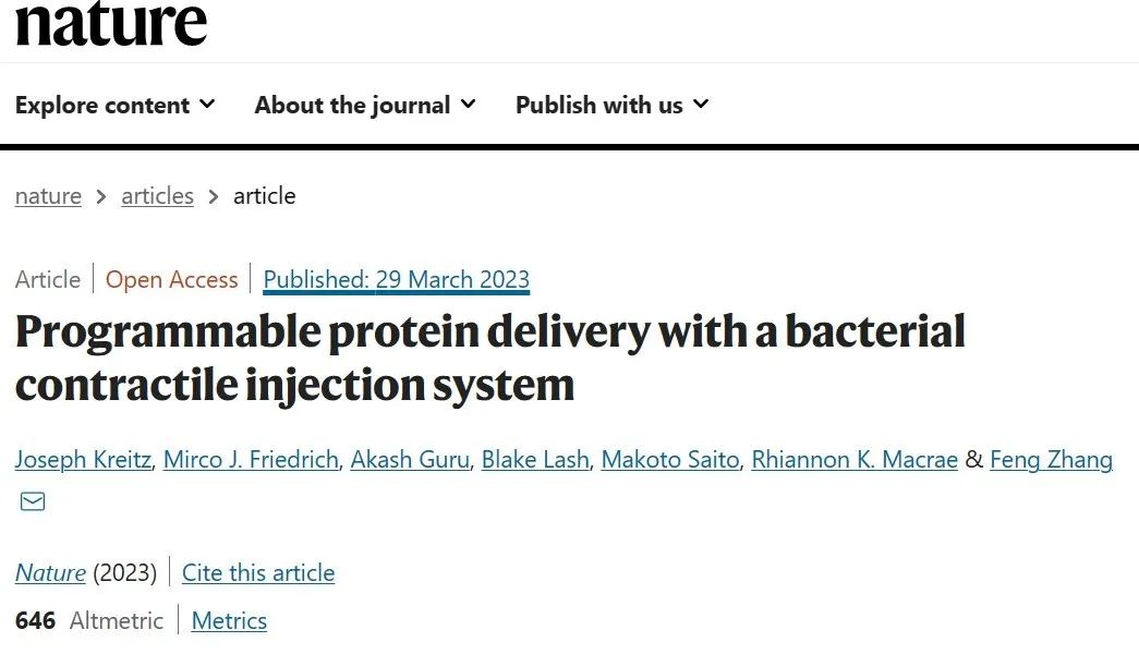 2023年3月底,CRISPR的先驅者,華人科學(xué)家張鋒教授及其團隊在 Nature 期刊發(fā)表了題為:Programmable protein delivery with a bacterial contractile injection system 的研究論文。