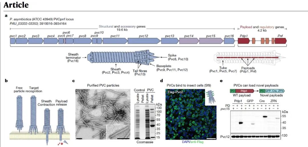 在這項最新研究中,張鋒團隊首先選定了eCIS的一個(gè)亞型——Photorhabdus virulence cassette(PVC)。PVC由一個(gè)約20kb的操縱子組成,包含16個(gè)核心基因(pvc1-16),以及下游的有效載荷Pdp1和Pnf。研究團隊發(fā)現,PVC有效載荷蛋白的N端高度無(wú)序區域是其“包裝結構域”,只要將其與想要遞送的蛋白(例如GFP)融合,就能將其加載到PVC復合體中。