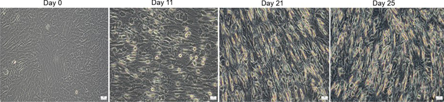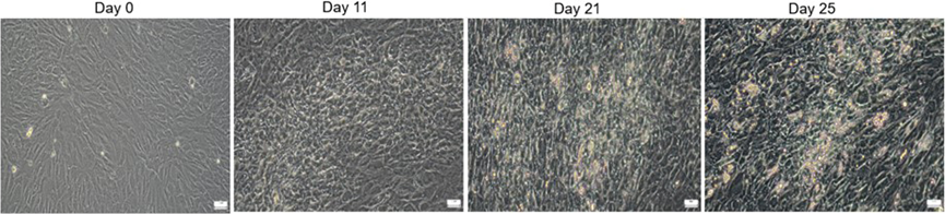 圖2:hTERT棕色前脂肪細胞在培養的第0-25天內不同時(shí)期下的分化形態(tài)的顯微鏡圖像。