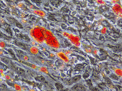 圖3:h-TERT永生化白色前脂肪細胞(ATCC®CRL-4063™)分化的白色脂肪細胞,在20倍物鏡下使用紅色油性染料染色后的顯微鏡圖像。