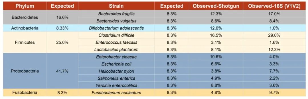 圖2 腸道微生物菌株標準品(ATCC® MSA-2006™)在鳥(niǎo)槍法宏基因組和16S rRNA的分析流程中應用