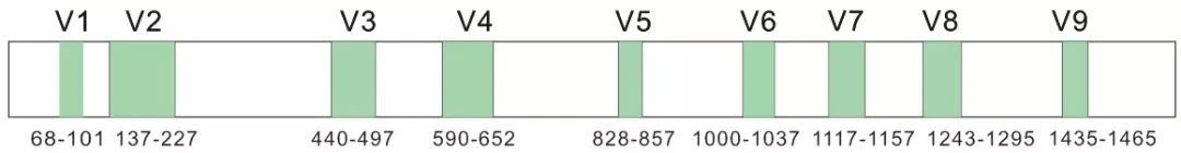 圖3 16S rRNA序列示意圖(大腸桿菌)綠色為高變區,白色為保守區
