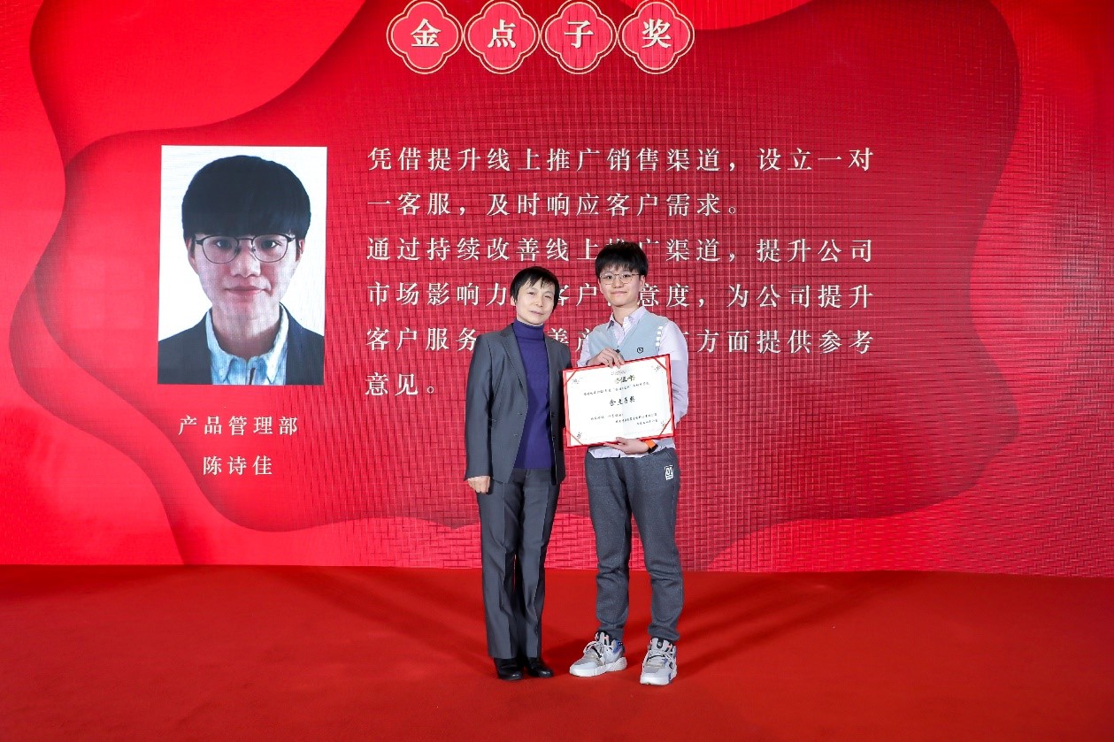 大會(huì )頒發(fā)的第二個(gè)獎項是金點(diǎn)子獎,基層的每一個(gè)聲音中源公司都非常重視,公司的發(fā)展都離不開(kāi)員工們的思想涌動(dòng)和創(chuàng )新思維。本獎項由平臺體系副總裁曹雪蕓為獲獎?wù)哧愒?shī)佳頒獎。