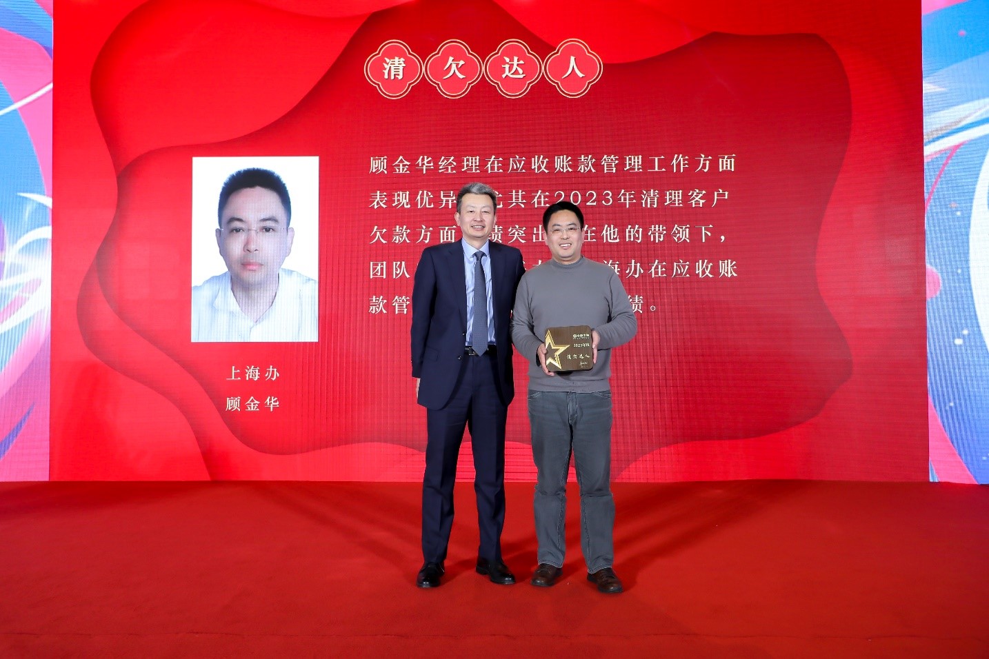 大會(huì )頒發(fā)的第三個(gè)獎項是清欠達人獎,由經(jīng)銷(xiāo)體系副總裁史忠為獲獎?wù)哳櫧鹑A頒獎。