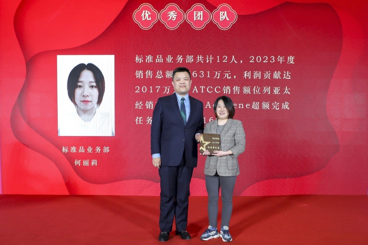 大會(huì )頒發(fā)的第四個(gè)獎項是優(yōu)秀團隊獎,由職能體系副總裁李志剛為獲獎團隊標準品業(yè)務(wù)部頒獎,部門(mén)副經(jīng)理何莉麗代表部門(mén)上臺領(lǐng)獎。