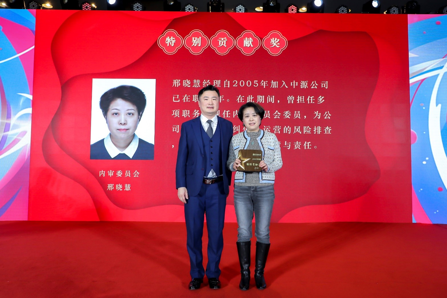 大會(huì )頒發(fā)的第六個(gè)獎項是特別貢獻獎,由朱曉勇總裁為獲獎?wù)咝蠒曰垲C獎。邢曉慧經(jīng)理在中源公司兢兢業(yè)業(yè)19個(gè)年頭,曾擔任多項重要職務(wù),已于1月31日正式退休,為表公司感謝特向邢曉慧經(jīng)理頒發(fā)特別貢獻獎。