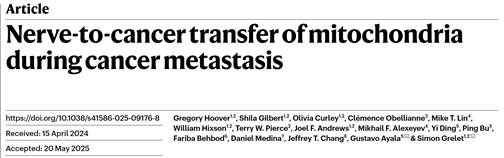 2025年6月底,美國南阿拉巴馬大學(xué)研究團隊,聯(lián)合美國德克薩斯大學(xué)研究團隊國際頂尖學(xué)術(shù)期刊在《 Nature 》發(fā)表突破性研究,揭示了神經(jīng)元通過(guò)線(xiàn)粒體轉移促進(jìn)癌癥轉移的新機制。文章的核心創(chuàng )新點(diǎn)是開(kāi)發(fā)了名為MitoTRACER的遺傳報告系統,能夠永久標記接收線(xiàn)粒體的癌細胞。