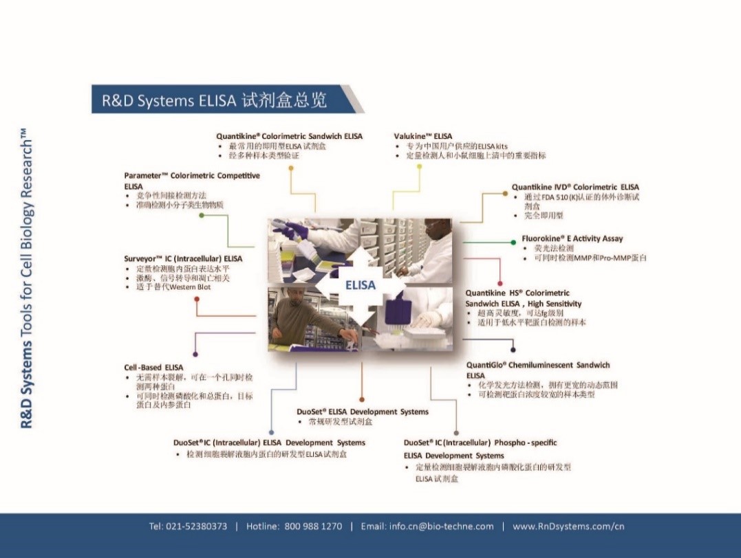 一個(gè)是傳承30年抗體研發(fā)經(jīng)驗,專(zhuān)業(yè)成就絕佳品質(zhì)的R&D Systems;它是一個(gè)全球性的細胞生物學(xué)資源庫:優(yōu)質(zhì)的蛋白質(zhì),抗體,ELISA試劑盒,實(shí)驗室試劑,和科研工具。R&D Systems公司擁有近30年致力于研發(fā)、測試和優(yōu)化免疫分析試劑盒的經(jīng)驗,已成為世界公認的金標準。目前,提供超過(guò)2000多種ELISA試劑盒。