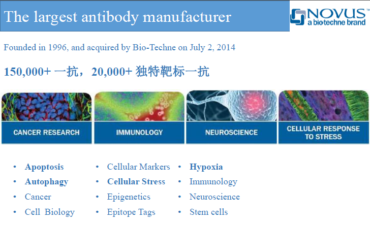 另一個(gè)是19萬(wàn)抗體應有盡有,全方位一站式服務(wù)標桿的Novus。它是一家位于專(zhuān)業(yè)的抗體生產(chǎn)公司,產(chǎn)品主要以抗體為主,涉及神經(jīng)生物學(xué),細胞凋亡,腫瘤,DNA修復,干細胞標記,信號轉導等多個(gè)研究方向。多年的抗體生產(chǎn)服務(wù)經(jīng)驗,使Novus得以引領(lǐng)生物科學(xué)發(fā)展趨勢,并可隨時(shí)為生物科研工作者提供前沿并廣泛的產(chǎn)品。