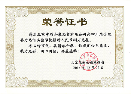 時(shí)間永是流逝,信念未曾改變。中原公司的愛(ài)心之火伴隨著(zhù)嚴冬的到來(lái)再度被燃起。2014年12月,一個(gè)明媚溫暖的午后,調皮的陽(yáng)光悄然躍入總經(jīng)理方先生的辦公桌臺,此時(shí),一個(gè)常規的電話(huà)聯(lián)絡(luò )中,從一位客戶(hù)口中獲知位于四川會(huì )理縣力馬河實(shí)驗學(xué)校(原名會(huì )理鎳礦子弟校)是一所地震災后重建的留守兒童學(xué)校,當地留守兒童眾多,他們由于長(cháng)年缺失父母的關(guān)愛(ài)和監管,很大一部分留守孩子都存在學(xué)業(yè)偏差、生活失助、心理失衡、道德失范、安全失保、感情缺失等問(wèn)題,急需得到社會(huì )關(guān)愛(ài)。中原公司曾有過(guò)數次捐助學(xué)校和資助貧困學(xué)生上學(xué)的經(jīng)歷,瞬間會(huì )理縣留守學(xué)生那一雙雙渴望求知,渴望被關(guān)愛(ài)的眼神立刻浮現在眼前。作為一名企業(yè)家,當即決定以中原公司名義向力馬河學(xué)校捐助2萬(wàn)元圖書(shū)和8萬(wàn)元現金,共計十萬(wàn)元用于該學(xué)校建設。